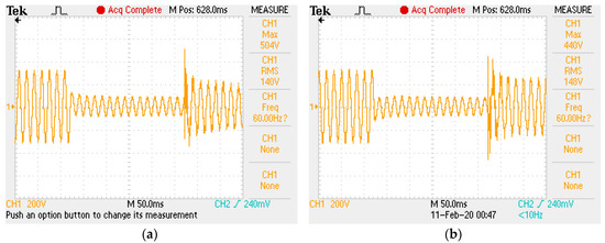 It can be observed in Figure 14 that the voltage collapses shortly after the end of the fault, indicating the system instability for these conditions. For the C-HIL scenario shown in Figure 14, where = 0.0 p.u., the CCT defining the stability limit is 191 ms, as presented in Table 3. In contrast, Figure 15a,b show a disposition for the VSG voltage to return to nominal values. In particular, for the situation in Figure 15b where = 0.1 p.u., the VSG voltage after the fault has a faster settling time, and returns more quickly to a steady-state level. Moreover, the maximum voltage overshoot reached at the time of fault clearance for = 0.1 p.u. is lower compared to the VSG with = 0.06 p.u. In the first case, the voltage reaches 504 V when the fault is cleared, while for the second scenario the voltage reaches a maximum of 440 V. Both C-HIL scenarios in Figure 15 presented post-fault stability, due to their higher CCTs provided by the adaptive control. For the scenario in Figure 15a, the stability boundary is defined by a CCT of 261 ms. Meanwhile, the scenario shown by Figure 15b has a stability boundary defined by a CCT of 355 ms. Both results are shown in Table 3.