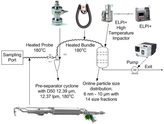 Sampling and analysis for the particulate matter distribution is carried out with the DEKATI HT ELPI+ instrument, which is a 15 stage impactor. The sampling line, which was connected to the flue gas line after the ESP, is presented in Figure 2. A heated sampling probe with an isokinetic nozzle, pitot nozzles and type K thermocouple, is inserted in a 3 inch horizontal opening to the flue gas line, followed by an accompanying cyclone. Flue gas velocity, based on the geometry of the sampling port and the relevant fuel and oxidant mass flows, was calculated, facilitating the selection of the appropriate nozzle diameter to ensure isokinetic suction. The sampling probe was heated at a constant temperature of 180 °C. The cyclone served the purpose to hold particles at 180 °C with D50 cut-off point of 12.39 μm (collecting 50% of particles) at a volumetric flow of 12.37 lt per minute so that the ELPI + instrument does not end up with very large particles and false measurements are generated. Following the cyclone, a flexible heating line is placed, operating at 180 °C, which in turn is connected with the High Temperature module of the ELPI+ instrument (HT ELPI+). The high temperature module provides a greater accuracy in exhaust gas analyses and does not cause phenomena such as flue gas cooling, which leads to PM loss as it sticks to cool surfaces. After ELPI +, a flow meter and a suitable suction pump were installed to generate exhaust gas flow to the sampling line.