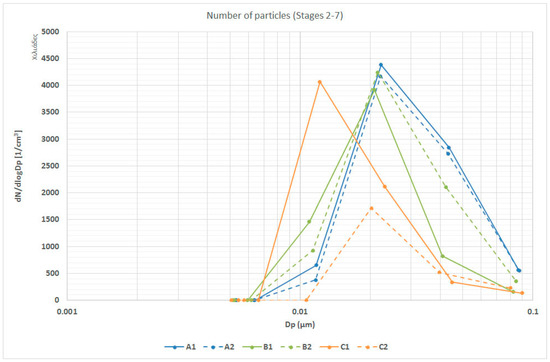 The results for the number of particles produced in each of the aforementioned experiments are given in Figure 3 and Figure 4. Comparing the experiments, two trends are observed. First, by increasing the substitution percentage of bituminous coal from pre-dried lignite (Experiments A1 and A2 vs. B1 and B2 vs. C1 and C2), there is a notable shift in the number of particles produced in larger diameters while, at the same time, the number of smaller diameter particles decreases. For instance, experiments A1 and A2 present the highest production of particles in diameters ranging from 0.001 to 0.1 μm and the lowest for diameters 0.4 to 10 μm, while experiments C1 and C2 present the greatest production of particles with diameters ranging from 0.4 to 10 μm and the lowest for diameters 0.001 to 0.1 μm. Therefore, pre-dried lignite combustion leads to the production of larger particles compared to bituminous coal combustion. Second, by introducing the combustion air through different stages, a slight decrease is observed in most cases for the particle number produced within the same pre-dried lignite substitution percentage. This staged feeding of combustion air benefits the low thermal NOx production as well. Lignites rich in alkaline earth metal elements produce larger quantities of particles above PM2.5 compared to other types of lignites or bituminous coals, as presented by [44]. This was mainly attributed to high calcium concentrations in the fuels’ ash. Furthermore, a similar trend was shown by [43], where, in the co-combustion of high in calcium and high silica lignite blends, the more the high silica lignite, the lower the production in PM10.