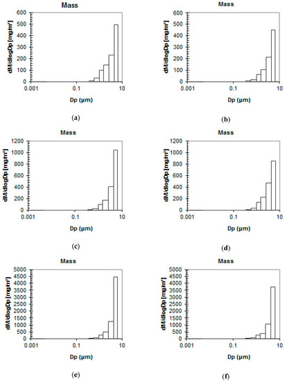 Distribution of mass concentration [mg/m3] for experiments: (a) A1; (b) A2; (c) B1; (d) B2; (e) C1; (f) C2.
