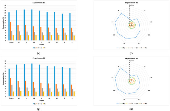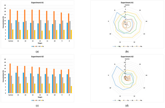 In Figure 7, the elemental concentration for fly ash particles is given as a percentage (%) of fly ash composition. The sulfur content shows an initial low concentration at the first stage (15) and a slightly higher value for the next stage (14), with a clearly particle-size-dependent inclination towards lower particle diameters. This follows a trend also depicted by [44], where sulfur content in the analyzed ash decreased with the increased in particle diameter.