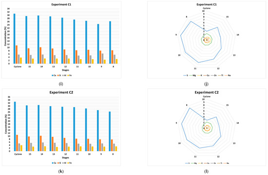 Elemental concentration (wt%) for fly ash particles for stages Cyclone, 15, 14, 13, 12, 11, 10, 9, 8 in bar chart for elements Ca, Si, Al, Fe and spider chart for elements S, Mg, K, Cu, Zn, Ti, Na for experiment: (a) A1; (b) A1; (c) A2; (d) A2; (e) B1; (f) B1; (g) B2; (h) B2; (i) C1; (j) C1; (k) C2; (l) C2.