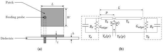 Illustrative schematic of a probe-feed squared-patch antenna (a) and its corresponding transmission line model (b).