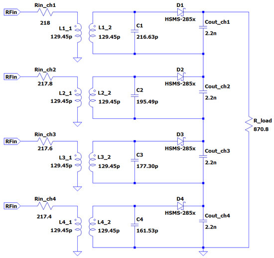 SPICE model of the proposed rectifier ; four channels are shown, whose operative frequencies are 950 MHz, 1000 MHz, 1050 MHz, and 1100 MHz, from top to bottom, respectively (values of components are also depicted).