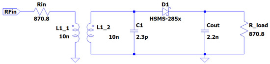 SPICE model of the wide-band rectifier ; values of components are also depicted.