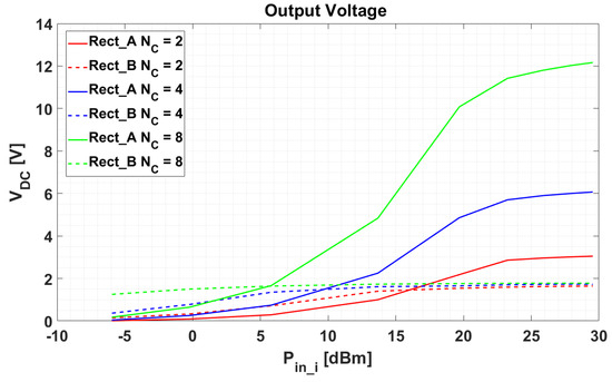 where represents the rectified voltage by the rectenna and is the number of used channels. Therefore, we expect that the overall voltage delivered to the load is a linear combination of voltage generators connected in series to the target load . When the received signal is composed by tones of equal magnitude, then each rectenna provides the same voltage contribution and the voltage across the load becomes as in Equation (21):