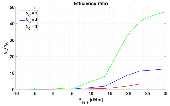 Efficiency ratio: comparison of and as a function of the input power level of the carrier generator and the number of carriers .