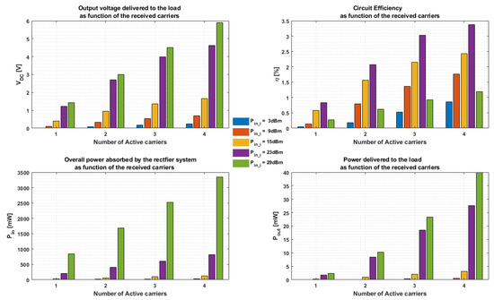 To demonstrate the validity of Equation (20), we characterized the proposed rectenna system (see Figure 2) by performing several simulations: first of all, the power level of equivalent generators () has been set equal for each employed carriers. Then, the overall power absorbed by the circuit (), the power delivered to the load (), the voltage across the load (), and the circuit efficiency () have been evaluated by activating the different carriers, from one at a time to four simultaneously. The simulation results are depicted in Figure 7, which shows that the output voltage increases by a factor equal to the number of active carriers, while the power increases with the square of the voltage, as expected by Equation (19). We also note that the maximum conversion efficiency is achieved when all carriers have a power level equal to . Further increasing this power level raises the output voltage; unfortunately, with a lower conversion efficiency.