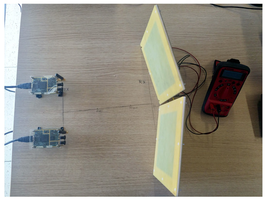 In-field testing aims to validate the proposed system for at least the two-carrier case. To this purpose, two frequency-spaced rectennas have been implemented. They are shown in Figure 8. In order to generate the CWs, two Software Defined Radio (SDR) transceivers (i.e., the USRP B205 model) equipped with omnidirectional antennas have been used; although, the CWs can also be generated by a single transceiver. However, the use of two non-synchronous transceivers is useful to test against randomness of signals incident on the rectennas. Indeed, in such way, signals are generated from different local oscillators and emitted by two separated antennas. The tests have been performed in laboratory setting a link distance to 1 m.