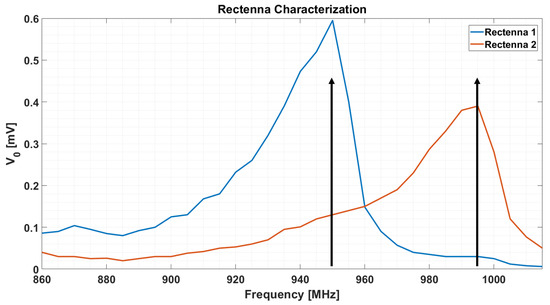 Frequency characterization of the implemented rectennas; this figure illustrates the maximum no-load voltage . The black arrows allude to the transmitted carriers.
