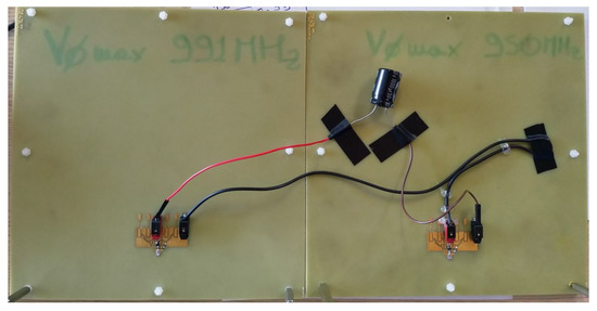 Manufactured microstrip antennas were printed on ITERA substrate (, m) targeting the frequencies 950 MHz and 1000 MHz. The overall area occupied by each rectenna is around mm (i.e., dielectric area), with the patch antennas of size mm for the lower frequency, and mm for the higher one. The rectifier is composed of the HSMS-286C Schottky diode and a capacitor of nF, as used in the simulation model. Each rectenna has been tested independently from the other to evaluate its effective frequency response. In other words, we analysed which frequency provides the maximum output voltage . In that case, a SDR transceiver has been configured to perform a frequency sweep. The measurement result is reported in Figure 9. We found a no-load voltage of V at 950 MHz for the lower-frequency rectenna, while a V peak has been found at 991 MHz for the second prototype.