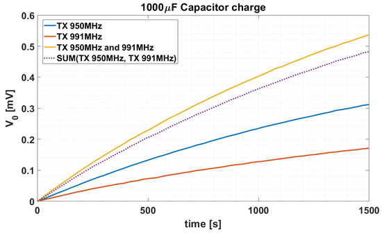 We set up the SDR transceivers accordingly to the antenna responses, i.e., one to transmit at 950 MHz CW and the other at 991 MHz with equal power. The rectennas were DC combined, as illustrated in Figure 10. Here, a large capacitor F has been connected in series to the rectennas to store the overall energy from RF. The conducted test employed a multimeter to measure the voltage across the load capacitor . The charging time has been measured for a period of 25 min and logged each 30 s, i.e., 50 samples at all were collected. The measurement results are depicted in Figure 11. From these, it can be assessed that the contribution of the 950 MHz-CW provides a voltage of 0.31 V. By transmitting only the 991 MHz-CW, then the output voltage is V. The latter value is lower as expected because the higher-frequency rectenna has a lower . By transmitting both the two CWs, the output voltage raises to the final value of V. The purple dotted curve in Figure 11 shows the sum of the single contributions measured separately (i.e., it is the sum of the blue and orange curves). By comparing this curve with the measurement performed on two active carriers, it can be observed a slight difference with respect to the linear relationship. This effect is due to the non ideal rectennas that have been exploited. As the measured voltage is different from zero outside the working carrier frequency for each rectenna, there will be an additional contribution (i.e., an higher voltage value) given from each rectenna on the other carrier frequency.