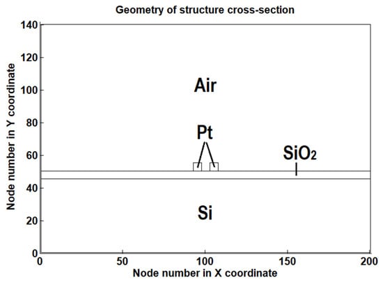 Nodes are numbered from the left to the right side, along the x-axis. After reaching the last point in a single row, the next part of the structure, being the nearest row from the top of the current row, was taken into consideration and numbered in the same way. Thus, node no. 1 was placed in the left bottom corner of the structure, while the node with the highest possible number, equal to nx∙ny, was located in the top right corner. The graphical representation of used discretization mesh for analyzed cross-section of the test structure, as well as the way mesh nodes were numbered, is demonstrated in Figure 2. It is also worth highlighted that the distance between nodes in both dimensions was set to 10 nm.