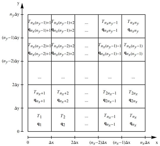 where and are 2∙nx∙ny-element vectors. The first part of vector consists of elements of vector T, while its second part includes elements of . On the other hand, the first and the second parts of the vector consists of elements of vectors and , respectively. Moreover, matrices E, A, B, and CT can be represented in the following way [39,40]: