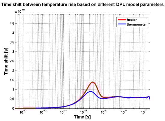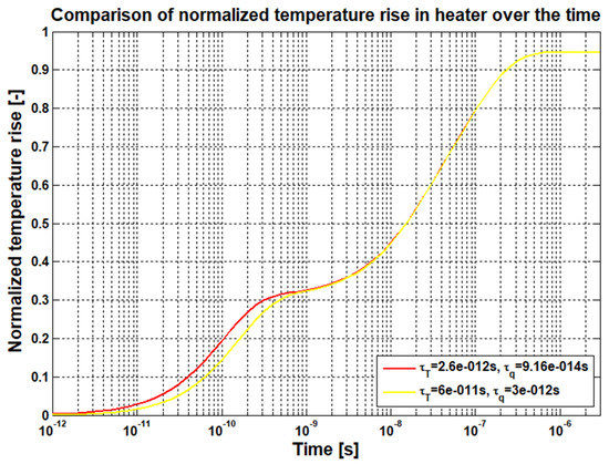 As it can be seen, the average temperature rise inside the heater is less than 95% of the maximal recorded temperature rise, while the temperature rise in the platinum sensor is characterized by a slightly more than 61% of the highest observed temperature rise. Differences in temperature rise values yielded for analyzed sets of DPL model parameters are observed between 1 ps and 1 ns.