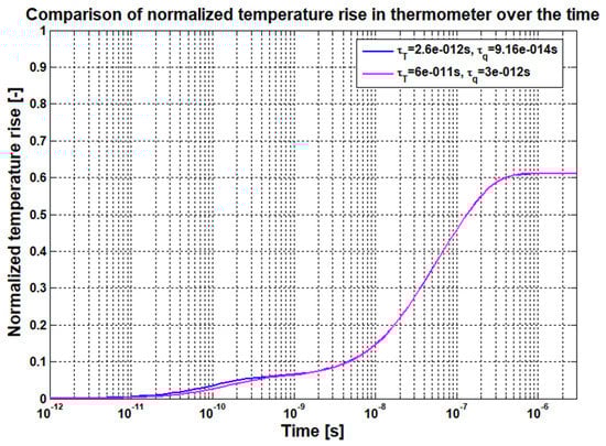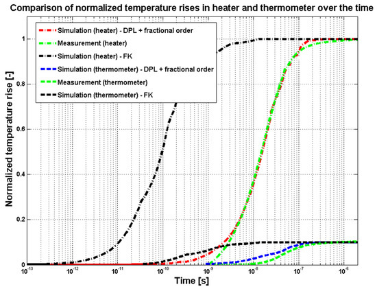 As it can be seen, both the heater and thermometer curves are characterized by relatively small values of MSE, RMSE, and SSE values. Moreover, the coefficient of determination and correlation coefficient suggest a proper recognition of a shape of the measured curve by a simulated one. Generally, it can be stated that calculated metrics (MSE, RMSE, SSE, coefficient of determination, and correlation coefficient) for the simulation fitting to the real data confirm highly accurate simulation results. This situation clearly shows that the proposed approach based on the theory described in Section 2 allows for the production of outputs reflecting the real thermal phenomena observed at the nanoscale. Moreover, as it was shown in Figure 7, the classical F–K model should not be used in the case of electronic nanosized structures.