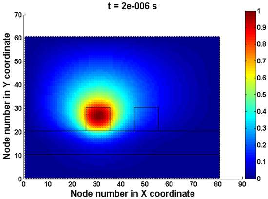 Thus, the full authors’ approximation scheme for the DPL model in two-dimensional Euclidean space is described by the system in Equation (21), including explanations formulated in Equations (15)–(22) and boundary conditions in Equations (12) and (13). The final solution of temperature-distribution changes over time in the analyzed cross-section of the test structure, based on the prepared approximation scheme, is determined by using the BDF method of a variable order between 1 and 5.