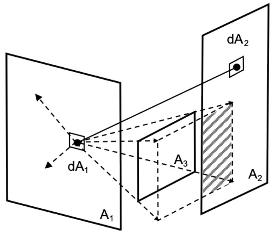 where A1 and A2 (m2) are the areas of surfaces 1 and 2; θ1 and θ2 (°) are the angles between the norms to surface differential elements dA1 and dA2 and the vector between those differential elements; r is the length of that vector [26]. This method is used in the View3D tool developed for evaluating radiation view factors between two 3D surfaces of interior surfaces in EnergyPlus. When a third surface is added between two planar surfaces, View3D calculates the blockage factor by tracing the rays between each two differential elements dA1 and dA2, represented as the shadowed area in Figure 3 [27]. The adaptation to the partial obstruction is less efficient in computing, and it cannot be used to calculate concave and curve surfaces as well.