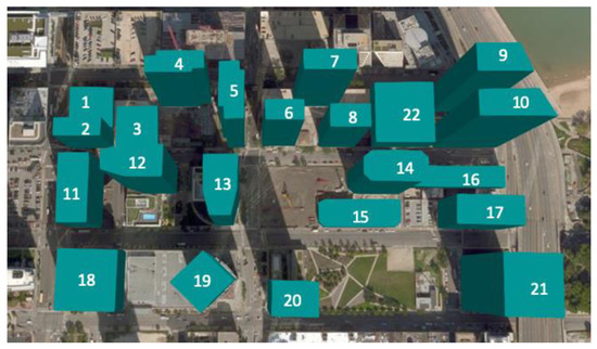 We then use CityBES to generate the EnergyPlus models for building energy simulation with the district buildings’ geographic and geometry information as input. CityBES models each building as an extruded polygon according to the building’s number of floors and height and applied zoning automatically based on the building footprint and building use type [28]. The models then infer detailed building systems and energy efficiency levels (e.g., insulation of envelope, lighting systems, HVAC systems, and equipment efficiency) based on the local building energy code of that particular year of build. The HVAC system types and efficiency levels are determined based on ASHRAE standard 90.1 [29]. Figure 5 is the CityBES visualization of the models, labeled with building IDs to facilitate further discussion.