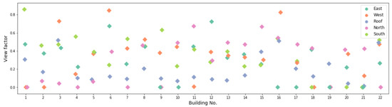 Averaging all surfaces on a façade, Figure 6 plots the average view factors of the four façades and the roof to surrounding surfaces of each building, calculated by the ray tracer we introduced.