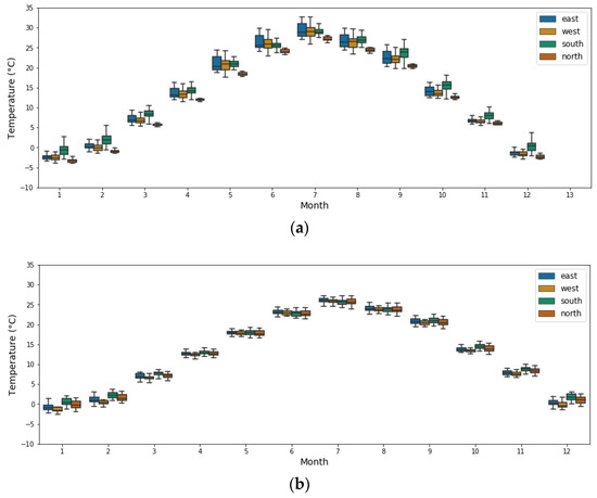 In different seasons of a year and different times of a day, the amount of solar radiation received by the four facades of buildings varies. We compared the monthly average exterior surface temperature, as shown in Figure 7, separating walls and windows. Each box plots the range of surface temperatures among all 22 studied buildings, with outliers neglected.