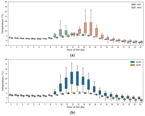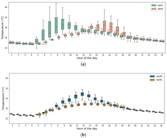 In Figure 8 and Figure 9, we picked January 21st and July 21st as a typical winter and summer day, respectively, and compared the hourly exterior wall temperatures, averaging each facade. Due to the daily variation of the sun position angle along with the shading effect from surrounding buildings, the surface temperature of different facades peaks at different hours of the day. In winter, the highest average temperature of the east, west, and south facades was observed at 11 am, 3 pm, and 12 pm, respectively. Although different buildings have a significant variation in surface temperature throughout the day, we still observe quite notable temperature gaps between opposed orientations on average. For east and west walls, the largest gap appears in the afternoon, when west facades have over 5 °C temperatures higher than the east ones. At noontime, the south facades with the largest view angle to the sun, observe a 15 °C higher surface temperature than the north facades, which benefit the least from the solar radiation during winter.
