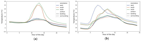 Temperature differences between facades and their surrounding surface—building 16. (a) 21 January; (b) 21 July.
