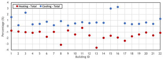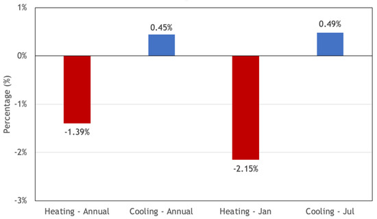 For each building, the heating energy decrease in winter and cooling energy increase in summer generally offset, resulting in a less considerable total energy consumption difference annually. For the district (Figure 13), the total heating and cooling energy differences are −1.39% and 0.45% for the annual simulation and are −2.15% and 0.49% for January and July in total.
