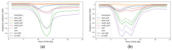 Surrounding buildings’ LWR received by exterior walls and roofs of building 16. (a) January 21st; (b) 21 July.