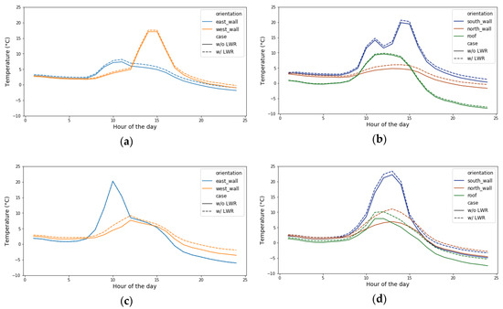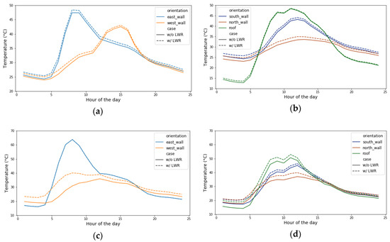 LWR impact on the exterior surface temperature of different façade and roof on 21 January. (a) Building 13—21 January; (b) Building 13—21 July; (c) Building 16—21 January; (d) Building 16—21 July.