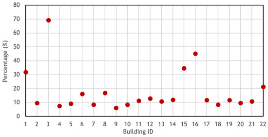 Due to the rise of the surface temperature, the heat transfer from exterior surfaces to the ambient air through convection and LWR also increases. As plotted in Figure 16, the difference is approximately 10–20% for the annual accumulated heat loss to the ambient air from most of the buildings, and the total increase at the district level is 11.6%. For the five low-rise buildings, in particular, the increase is remarkably higher, contributed by the roof temperature increase.
