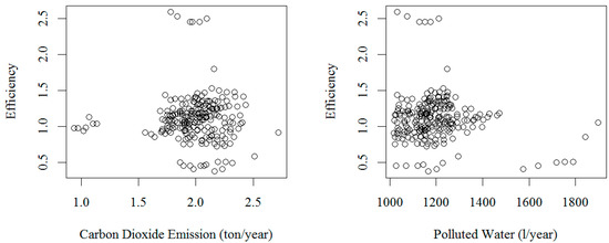 Figure 3 presents a scatterplot panel of efficiency levels against the two undesirable outputs. As expected, super-efficiency scores fluctuate around 1, although not symmetrically. Readers should recall that inefficient plants present scores higher than 1.0 and that a score of 0.6, for instance, indicates a less efficient plant than another one with a score of 0.5. Figure 3 reveals that inefficient thermal power plants tended to emit more CO2, although this direct relationship did not appear to be so strong in terms of polluted water. In fact, the following results could be observed when comparing the groups between efficient and inefficient plants. While the efficient plants present a CO2 emission level that was 1.08% lower than those observed in the inefficient plants, the discharge of polluted water between both groups presented even a smaller variation (around 0.33% less).
