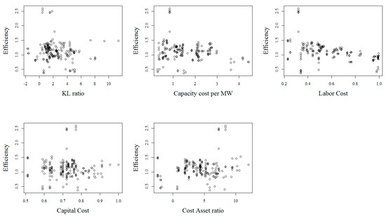 Similarly, Figure 4 also presents a scatterplot panel of efficiency levels, but now against cost structure variables. Figure 4 clearly shows that inefficient energy generation prevailed when Angolan thermal plants presented a lower KL ratio, meaning that they are labor intensive, and had a higher cost–asset ratio, which means that they have higher operating costs in comparison to the value of their assets. As regards the lower KL ratios, the state-controlled operation of Angolan thermal plants may explain the excessive number of highly paid employees in relation to the size/scale of the plant. On the other hand, higher cost–asset ratios may reflect the operation of older, smaller, poorly maintained plants. With this cost structure in mind, the adoption of costly technologies for controlling CO2 emissions may be enhanced by opportunities that emerge from rebalancing KL and cost–asset ratios. This is necessary because adopting carbon capture devices would certainly increase the cost to asset ratio. Therefore, labor expenses should be rightsized first in order to open room in cost expenditure before adopting such an antipollutant measure.