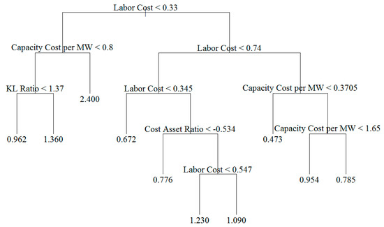 Hence, the distinctive aspect of the current research in comparison to the other previous researches is the joint use of novel super-efficiency models and statistical learning techniques to unveil the relationship between cost structure (as a proxy of the productive technology) and efficiency levels in thermal power plant energy generation. As explored in Section 5.2., statistical learning methods constitute a useful approach for unveiling hidden relationships between efficiency scores and cost structure variables, as long as they do not rely on the traditional parametric assumptions found in the typical regression approach (Tobit, truncated bootstrapped regression, beta, and Generalized Method of Moments (GMM), cf. Table 1), yielding higher analytical flexibility and explanatory power.