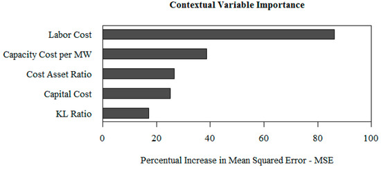 These results are confirmed by the bootstrapped regression trees presented in Figure 5 and Figure 6. While Figure 5 depicts the bootstrapped regression tree structure and its thresholds at each tree node, Figure 6 shows the most impacting variables in terms of overall increase in the Mean Squared Errors (MSE). The interpretation of a regression tree is very straightforward in terms of allowing the decision-maker to segment the results. For example, the first branch of the tree presented in Figure 5 states that “if labor cost is lower than 0.33 and capacity cost is lower than 0.80, and KL ratio is lower than 1.37, then the average plant efficiency is 0.962 (almost weak-efficient)”. The other branches read similarly. Both figures suggest that capacity cost and labor cost are the most impacting variables on Angolan thermal power plant efficiency.