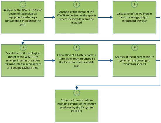 Two main contributions are introduced in this research: (i) the feasibility analysis and optimal sizing of grid-connected PV system, with and without storage battery, in WWTP; (ii) the complete impact assessment of 3-E indicators of PV system integration in WWTP. Considering those two main contributions, a logical research methodology has been developed which is shown in the flowchart of Figure 1. First, three steps, 1, 2, and 3, are dedicated to data acquisition of WWTP energy consumption, and to analysis of PV system’s optimal installation and to energy demand-response calculation. Next, step 4 of research methodology refers to calculating of environmental impact of WWTP along with PV system in terms of carbon released into the atmosphere and energy payback time. In order to store the energy produced by PV system in the most favorable case, a storage battery is calculated in step 5. Analysis of PV system’s impact on power grid by using “matching index” and of economic impact of energy produced by PV system, with and without storage battery, by using LCOE is done in step 6, respectively 7. All these steps of the research methodology are detailed in the next sections of paper.