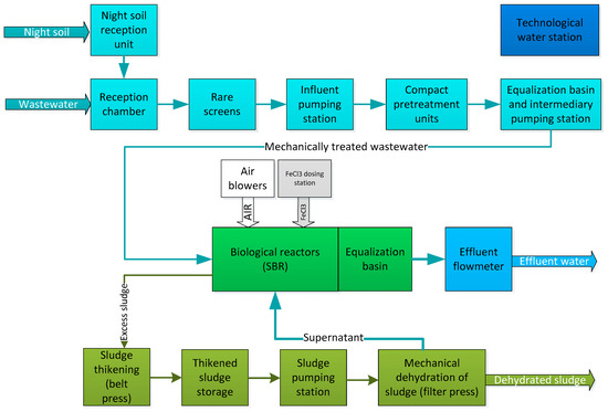 In Table 1, the installed powers of different treatment stages are summarized: mechanical pretreatment (includes coarse screens and compact mechanical treatment units); influent pumping station (includes influent pumping station and night soil reception station); SBR biological reactors (includes submersible mixers, air regulating servo-valves, mobile decanter); blower station (includes the blowers for biological process); technological water pumping station; sludge thickening and dewatering (includes all processes on the sludge treatment line, according to Figure 2).