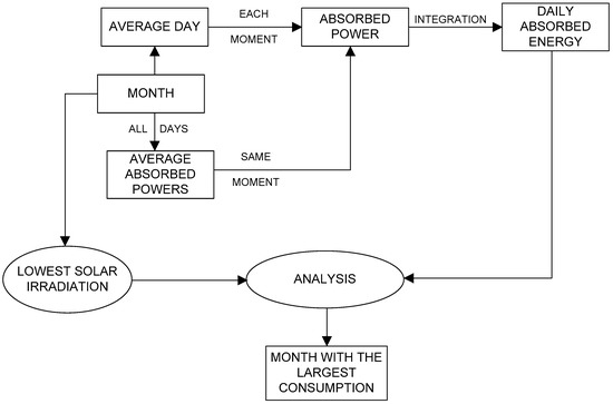 - A monthly analysis of the energy consumption is performed, to identify the month with the largest consumption in relation with the month with the lowest solar irradiation.