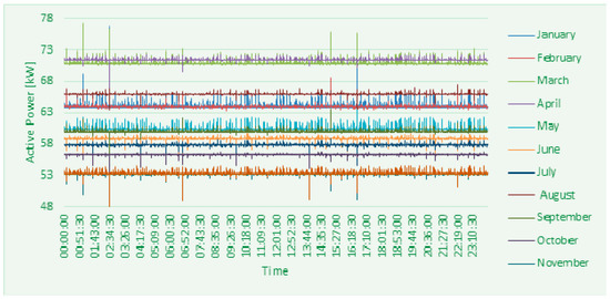 The purpose for this averaging, instead of using directly the daily energy average for PV sizing, was to identify if certain patterns of energy consumption can be identified during the day. For example, if, in a certain time interval, the energy demand would be consistently higher (or smaller) each day of a month, then the design of the PV could be optimized in what concerns the energy output at that time interval.