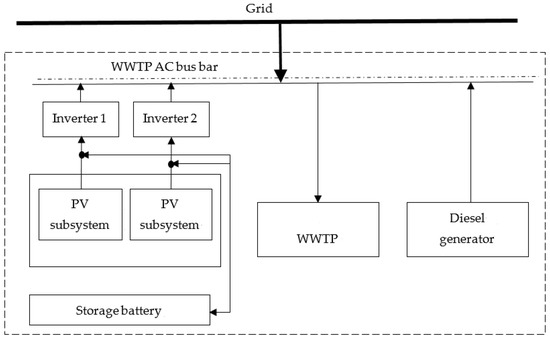 The power system for the WWTP was designed as a hybrid system integrating public power grid, PV, storage battery and diesel generator, shown in Figure 5. The diesel generator is a back-up measure designed to maintain the treatment process in operation for several hours, to avoid discharging untreated wastewater to the natural effluent if grid faults would.