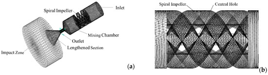 Three-dimensional geometric model for the simulation of the swirling-round SC-CO2 jet flow field: (a) meshing of the flow region; (b) amplification of meshing at the rotating impeller and central channel.
