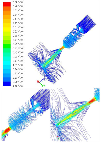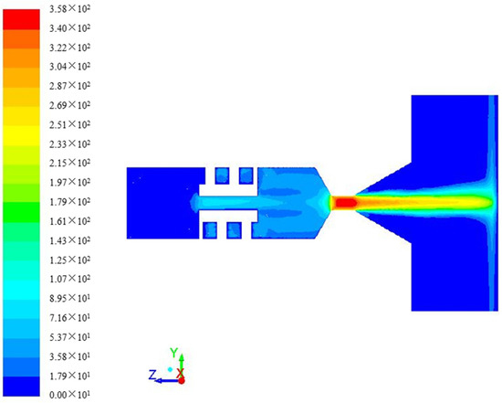 The supercritical CO2 enters the nozzle and is split into two jets. One of the jets accesses the straight channel, forming a round jet, while the other one enters the rotating channel, generating a swirling jet. The round jet and swirling jet are fully mixed in the mixing section, giving rise to a swirling-round SC-CO2 jet flow, which hits the wall after flowing through the nozzle outlet and lengthened section. Figure 3 and Figure 4 reveal the flow field simulation results. When the SC-CO2 flow through the convergent section of the nozzle, fluid pressure decreases, and flow velocity sharply rises, resulting in the swirling-round SC-CO2 jet flow that hits the wall on the right side. Not surprisingly, the hitting speed reached its maximum on the jet axis, while getting lower to both sides.