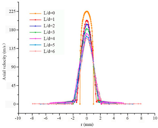 Figure 5 exhibits the distribution and evolution of axial velocity. The axial radius r is given as the abscissa. Sensitivity analysis is performed in regard to the dimensionless jetting distance, defined as the ratio of jetting distance L and the nozzle’s outlet diameter d. It is shown that the flow speed reaches its maximum at the central line, demonstrating more concentrated energy if L/d is zero. In contrast, energy drops sharply in the radial direction. This leads to a more substantial jet impact and a certain depth in perforating. When ejecting fluid of high speed, the entrainment effect of a swirling jet favors driving the flow of surrounding fluid and exchanging energy, which attenuates the axial velocity of jet flow.