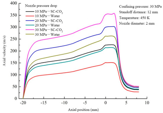 Figure 7 shows the axial velocity profiles of swirling-round SC-CO2 jet and water jet to compare their flow fields under the same parameters. Temperature and confining pressure are set as 450 K and 30 MPa, respectively. The wall surface is located at −20 mm of the axial coordinate, and 0 mm at the axial coordinate represents the nozzle’s outlet. As depicted in Figure 7, the maximum speeds of swirling-round SC-CO2 jet flow exhibit higher values compared with that of water jet under all pressure drops. For example, at the pressure drop of 30 MPa, the maximum speed of swirling-round SC-CO2 jet reaches 358 m/s, significantly higher than 263 m/s of the water jet. According to the Bernoulli equation, if the nozzle’s pressure drop maintains constant, then the SC-CO2 jet speed is higher than the water jet speed, due to the lower density of SC-CO2.