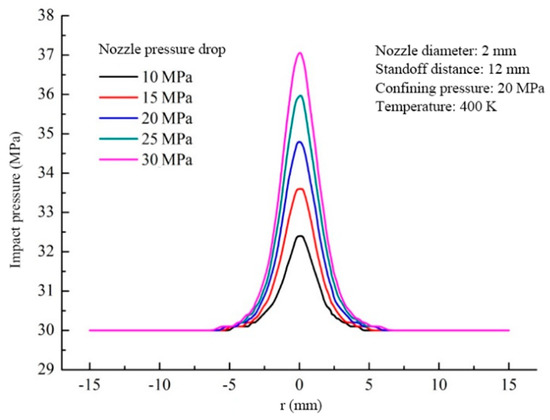 The nozzle’s pressure drop plays a significant role in determining the kinetic energy of jet flow, which directly influences the characteristics of the jet flow field. As the nozzle’s pressure drop increases, jet energy rises, improving the effect of rock breakage. Figure 8 depicts impact pressure under variant pressure drops of the nozzle. It is suggested that a higher pressure drop yields higher impact pressure. As a result, if the confining pressure remains invariant, the impact pressure increases with an increasing pressure drop. The pressure drop induced kinetic energy of jet flow rises as the nozzle’s pressure drop increases, and thus the impact pressure acting on the wall surface arisen from the jet flow. However, it should be noted that the impact range does not show a noticeable enlargement at a higher pressure drop.