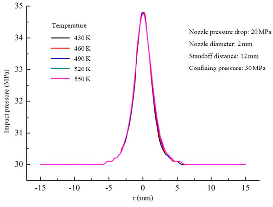 Figure 10 demonstrates fluid temperature effect on impact pressure. It is anticipated that temperature might influence the flow field by affecting the physical properties of a fluid. However, as shown in the figure, impact pressure and the action range of impact pressure are hardly influenced by temperature changes varying from 430 K to 550 K. It is worth noting that further variation of temperature demonstrates similar results (data not shown). Therefore, we conclude that fluid temperature can be ignored for engineering applications.
