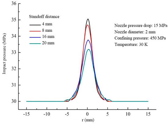Jetting distance has a significant influence on rock breakage. Proper adjustment is essential to use jetting energy efficiently. As shown in Figure 11, impact pressure decreases with an increasing jetting distance. The impact range, however, expands slightly. When the jetting distance is small, the development of jet flow is inadequate and, therefore, the impact range is narrowed. Nevertheless, if the jetting distance is oversized, the high dissipation of jet energy might occur and lead to a slump of impact pressure. Accordingly, only if the jetting distance is appropriately selected can we achieve perfect impact pressure and action range of the SC-CO2 jet flow, thus acquiring the desired rock-breaking effect.