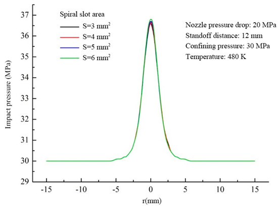 One may expect that the flow channel’s area can have a considerable effect on the generation of swirling jet. Figure 13 presents the influence of the grooving area (3 mm2, 4 mm2, 5 mm2, and 6 mm2) on swirling-round jet flow. As depicted, the larger grooving area of the impeller yields a slightly higher impact pressure. This could be explained by the fact that, rather than swirling jet, the round jet is the primary control of impact pressure. As a result, the grooving area could be neglected in practice due to its weak influence on the strength and impact range of the jet flow.