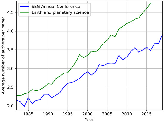 Growth rate of the number of co-authors for the SEG Annual Conferences and the Earth and Planetary science [17].