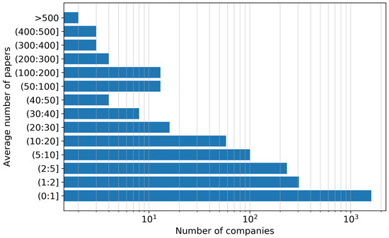 Figure 5 correlates the number of companies with the corresponding number of publications. More than 2400 industry companies and academic institutions from 86 countries have presented their research at the SEG annual conferences so far. There are only two companies that on average have published more than 500 publications (Schlumberger and CGG), and there are more than 2100 companies that published five papers or less. The five companies with the most significant number of publications in the SEG annual conferences are (1) Schlumberger (Houston, TX, USA), (2) WesternGeco (Crawley, UK), (3) CGG (Compagnie Générale de Géophysique, Paris, France), (4) BGP Inc., (BGP Inc., China National Petroleum Corporation, Beijing, China), and (5) BP plc (formerly The British Petroleum Company plc and BP Amoco plc, London, UK). These five companies accounted for about 30% of all paper affiliations over the last ten years. Schlumberger constitutes about 8% of all affiliations, with WesternGeco adding about 5% in the past ten years. The number of companies that have published less than five papers over the years has been growing gradually [12]. We suggest that increase in the number of companies with a small number of publications indicates digital technologies adoption. After all, it is cheaper to deal with data processing than exploration, which requires seismic equipment and a large staff. It is reasonable to assume that the presence of small companies at the SEG annual meetings will continue to grow.